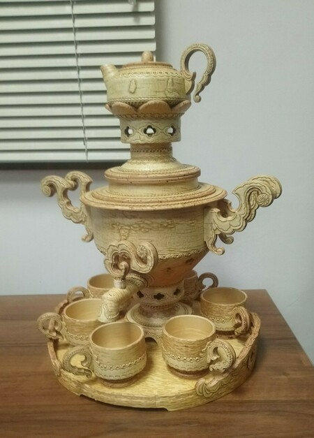 Предлагаем вашему вниманию исключительно оригинальный подарок из бересты, сделанный в русском стиле. Это чайный набор с самоваром "Милован", емкостью 5 литров. Все предметы набора сделаны из одной бересты - это уникальный природный материал (верхний слой коры березы), который обладает удивительными бактерецидными и теплоизоляционными свойствами. Самовар сам воду не нагревает, но кипяток, налитый в него, сохранит свою температуру до 3-4 часов. В заварном чайнике можно заваривать ароматный чай. Этот набор позволит вам организоват удивительную чайную церемонию в русском стиле, и поддерживать беседу в течении долгого времени.
